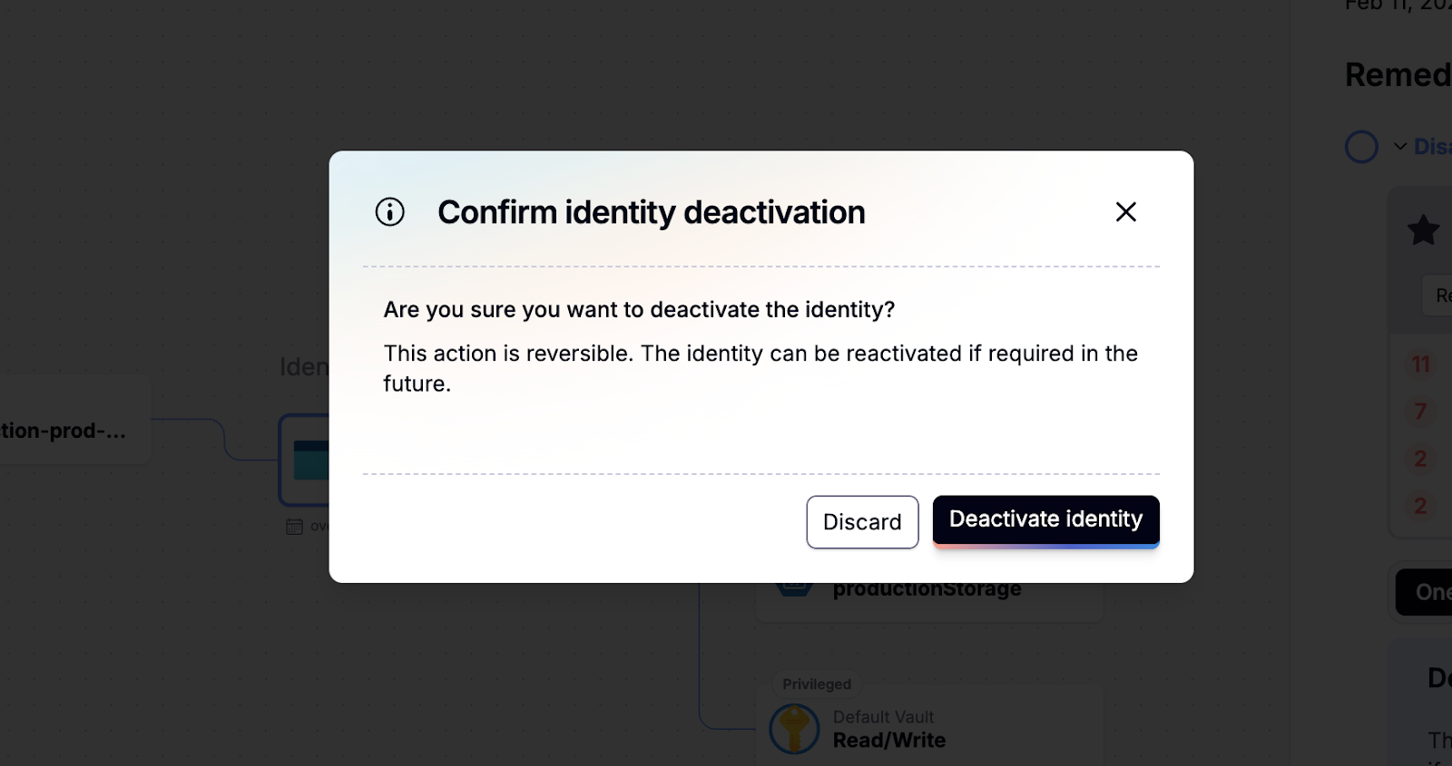 Instead of a blanket 90-day rotation requirement, you can implement risk-tiered controls based on what an identity can do and where it operates. A read-only service account in staging doesn’t carry the same risk as an API key with write access to production finance data. Treating them identically under a static rule creates friction without reducing real risk. With policy intelligence, teams can choose the right outcome per identity: approve as-is, right-size permissions, rotate credentials, reassign ownership, or disable and decommission.